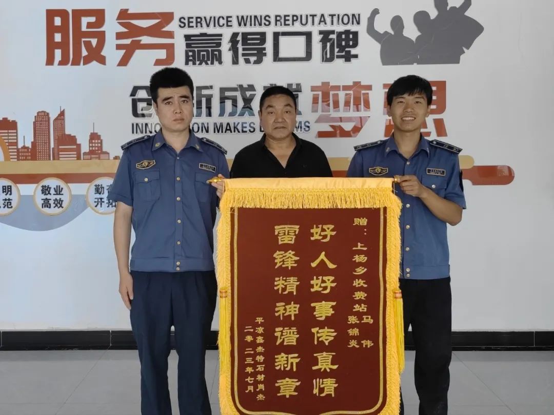 近日,市民肖先生專程驅(qū)車來到平華一級公路上楊收費站,將一面錦旗送到了馬錦炎、馬偉兩名同志的手中,錦旗上寫著“好人好事傳真情,雷鋒精神譜新章”,表達對平華一級公路上楊收費站工作人員的感謝。