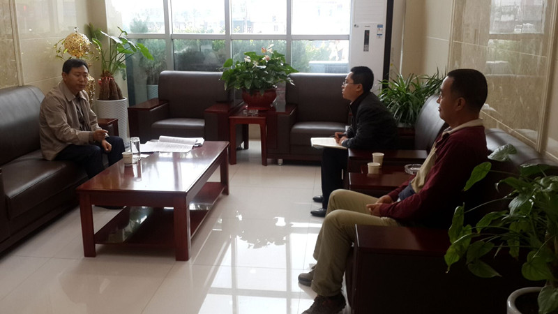 圖為公司副總經(jīng)理柳振源與試用期滿工作人員進行考核談話
