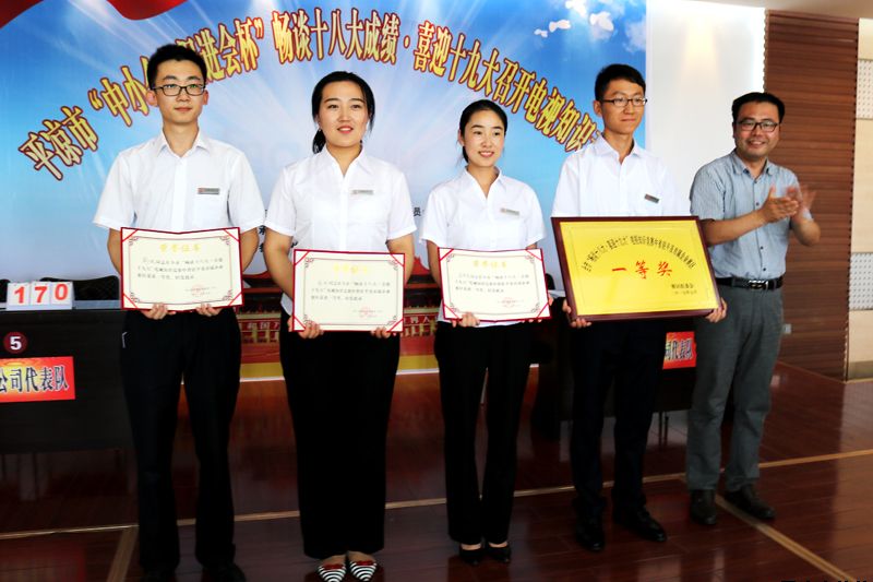 競賽結(jié)束后,伴隨著歡快的音樂聲,市委宣傳部副部長雷勇走上臺(tái),為全市暢談十八大·喜迎十九大電視知識(shí)競賽中省駐平及市屬企業(yè)賽區(qū)第一名——平?jīng)鍪谢菝窆敬黻?duì)頒發(fā)一等獎(jiǎng)獎(jiǎng)牌和證書。