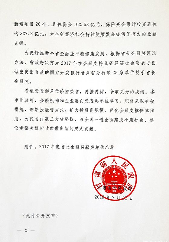 7月23日,省委、省政府召開全省金融工作會議,對2017年支持我省經(jīng)濟發(fā)展貢獻(xiàn)突出的單位授予省長金融獎,平?jīng)鍪谐青l(xiāng)建設(shè)投資有限責(zé)任公司榮獲該獎項,這是平?jīng)鍪?017年度唯一一家獲此殊榮的單位。