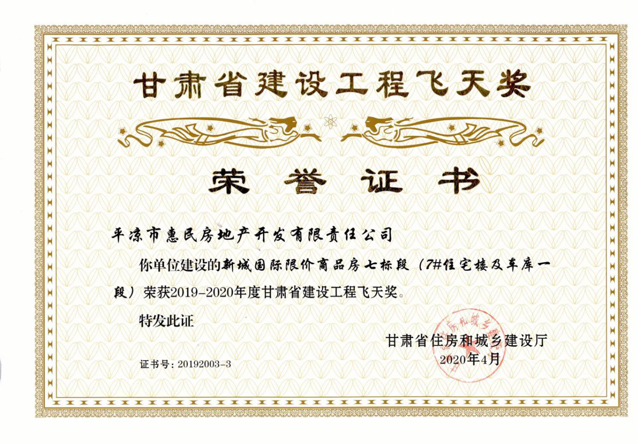 我公司2014年開發(fā)建設(shè)的新城國際小區(qū)7號(hào)樓,斬獲2019-2020年度甘肅省建設(shè)工程“飛天獎(jiǎng)”。據(jù)悉,該獎(jiǎng)項(xiàng)是甘肅省建設(shè)工程質(zhì)量最高榮譽(yù)獎(jiǎng),在市優(yōu)質(zhì)工程的基礎(chǔ)上,每年評(píng)選表彰一次。榮獲該獎(jiǎng)項(xiàng),是對(duì)惠民公司房產(chǎn)開發(fā)項(xiàng)目質(zhì)量的又一次肯定。