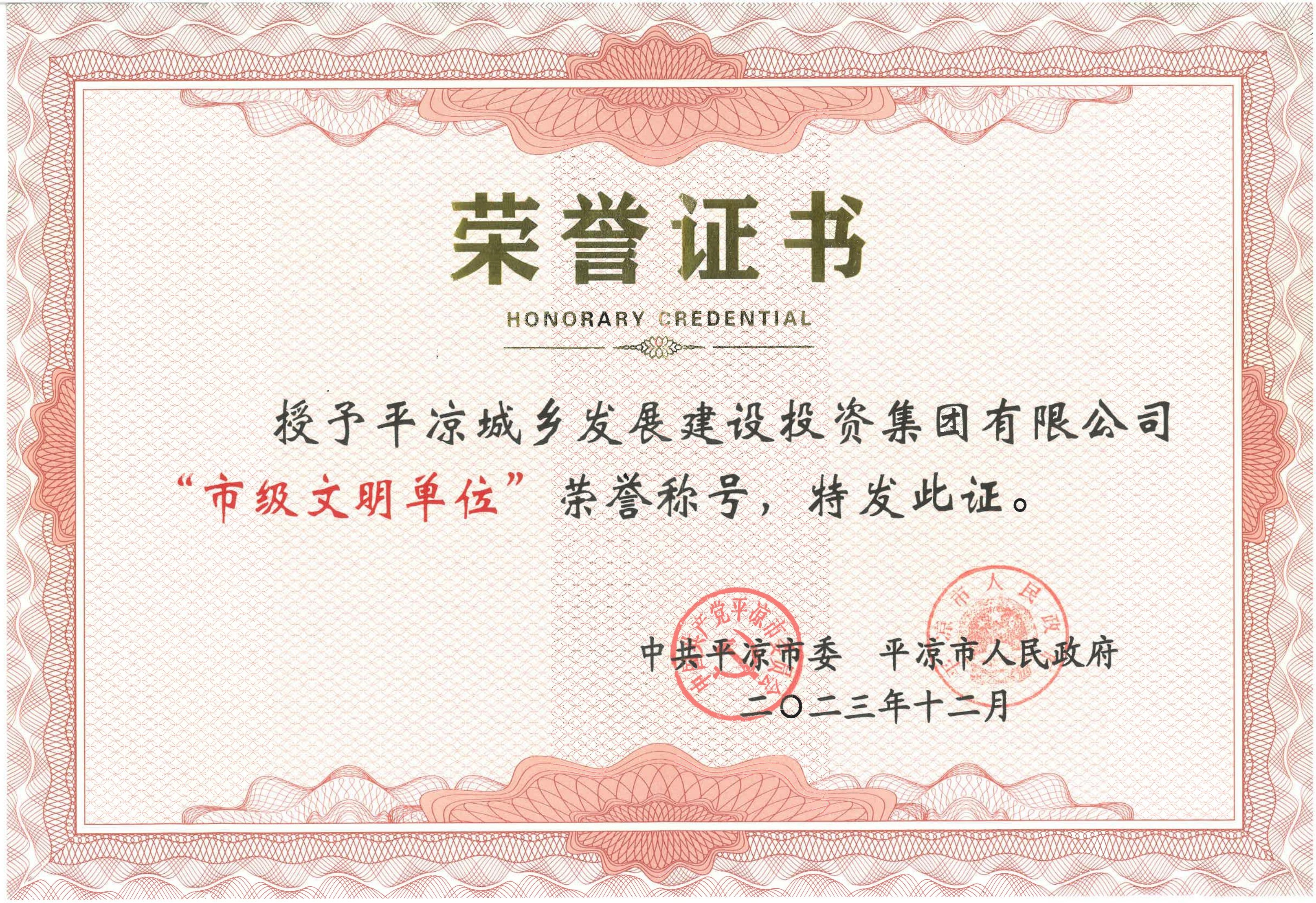 12月22日,市委、市政府印發(fā)《關(guān)于命名第二十四批市級文明單位、第十二批市級文明村鎮(zhèn)、第九批市級文明社區(qū)、第四屆市級文明校園和文明家庭的決定》,授予平?jīng)鍪谐青l(xiāng)發(fā)展建設(shè)投資集團有限公司“市級文明單位”榮譽稱號。