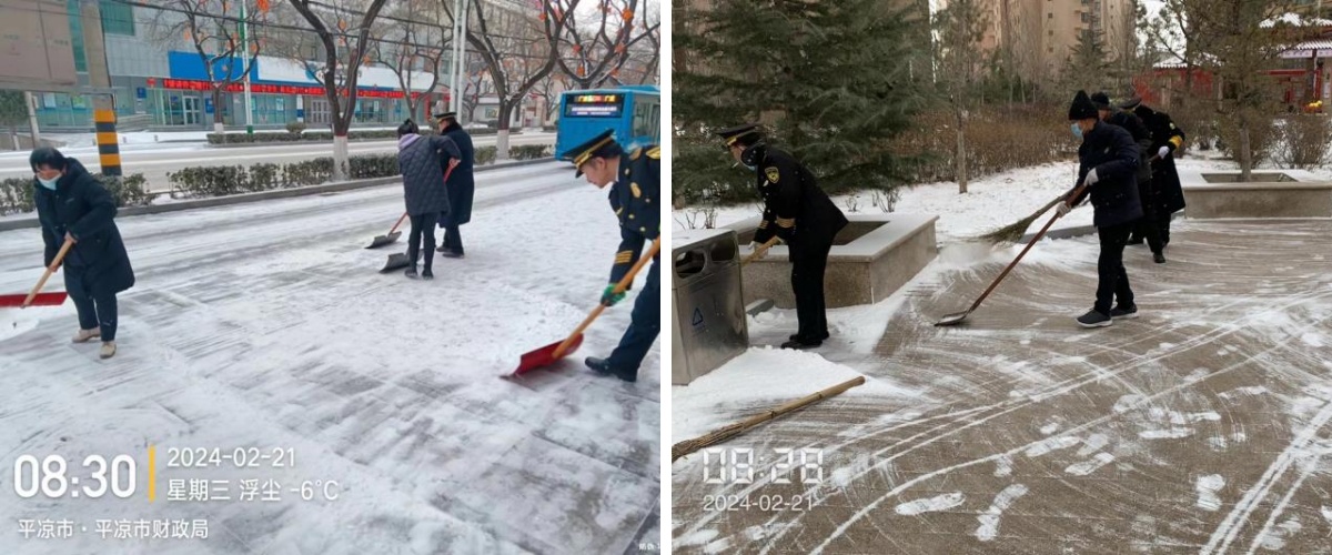 2月21日清晨,平?jīng)鲑e館全體職工就立刻奔赴各自負(fù)責(zé)的“戰(zhàn)場(chǎng)”,開(kāi)展掃雪工作。大家不畏寒冷,拿起鐵鍬、掃帚等除雪工具,迅速開(kāi)展清雪活動(dòng),及時(shí)消除道路安全隱患,為客人出行保駕護(hù)航。