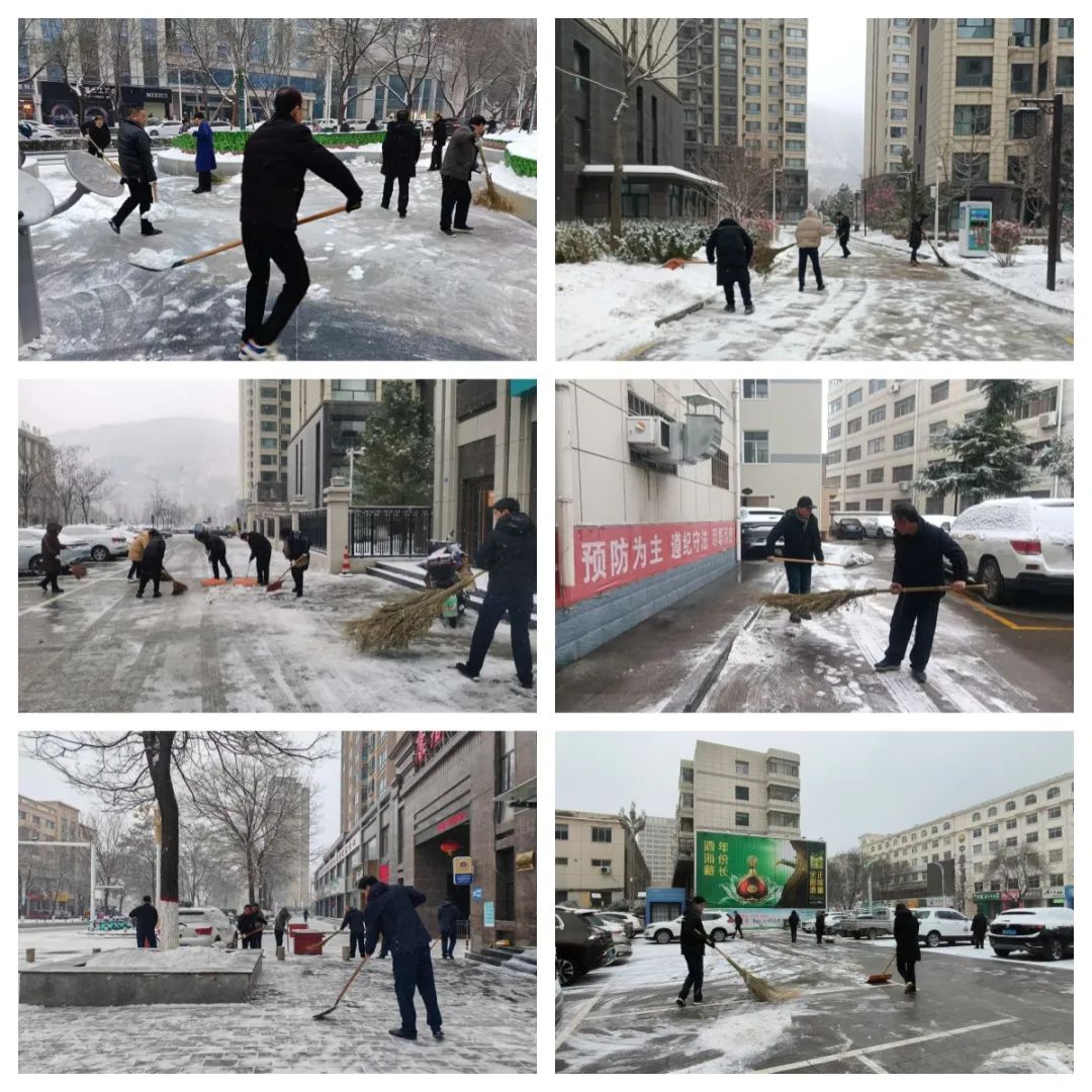 各經(jīng)營服務(wù)單位身先士卒,不畏嚴(yán)寒,頂著風(fēng)雪,利用手中的雪鏟、鐵锨、掃帚等工具,互相配合,分工合作,熱火朝天的勞動場面讓寒冷的天氣顯得暖意濃濃。在群眾出行前,已將區(qū)域主要道路和人行道積雪清掃干凈,用實際行動驅(qū)散雪天嚴(yán)寒,為群眾清掃出一條“安全路”,開辟出一條“暢通路”。