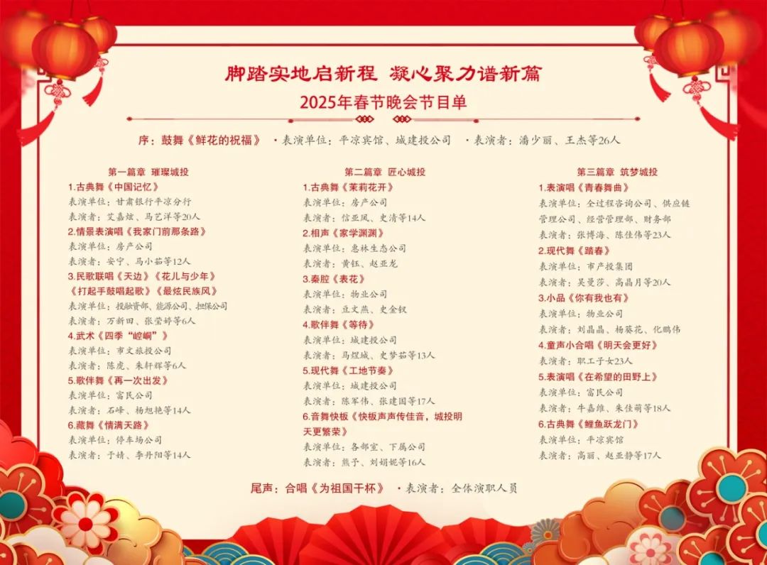節(jié)目由集團公司各部室、下屬各公司精心編排,邀請甘肅銀行平?jīng)龇中?、市產(chǎn)投、市文旅投公司傾情助演,全面展示了集團公司在深化改革、轉(zhuǎn)型發(fā)展中取得的輝煌成就以及干部職工勇?lián)姑?、奮勇爭先、攻堅克難、真抓實干、昂揚向上的精神風貌。
