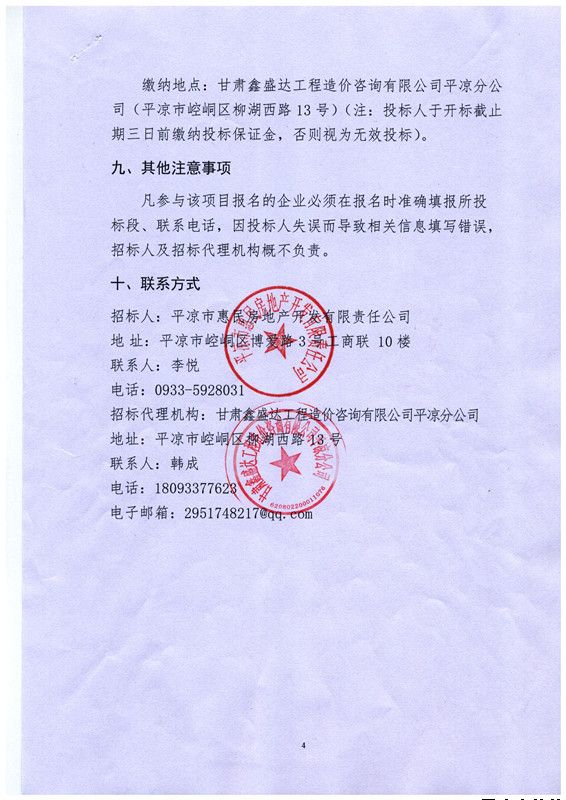 繳納地點:甘肅鑫盛達(dá)工程造價咨詢有限公司平?jīng)龇止荆ㄆ經(jīng)鍪嗅轻紖^(qū)柳湖西路13號)(注:投標(biāo)人于開標(biāo)截止期三日前繳納投標(biāo)保證金,否則視為無效投標(biāo))。