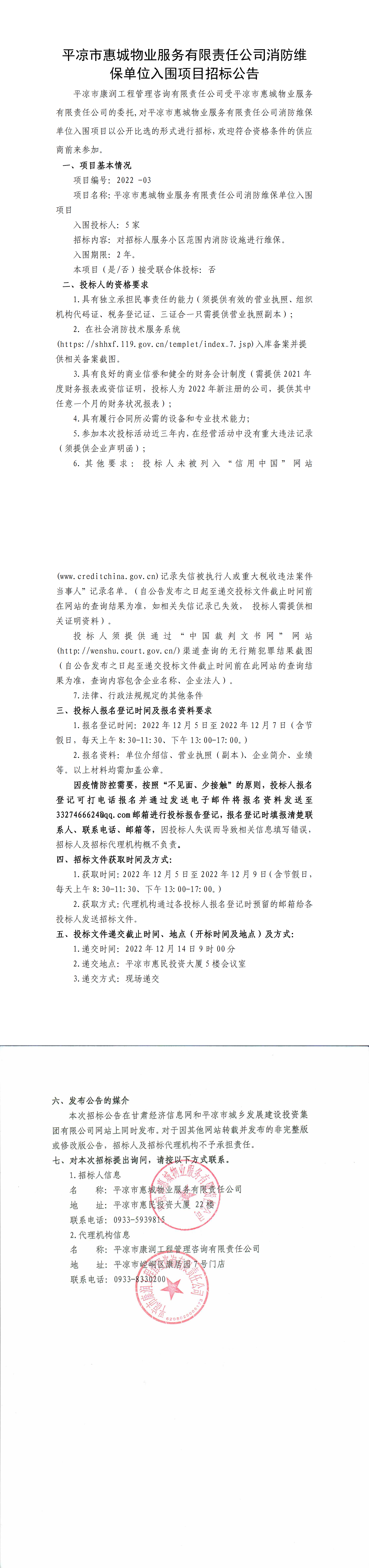 平?jīng)鍪谢莩俏飿I(yè)服務(wù)有限責(zé)任公司消防維保單位入圍項(xiàng)目招標(biāo)公告